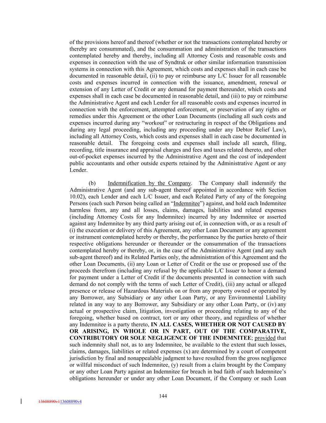 of the provisions hereof and thereof (whether or not the transactions contemplated hereby or thereby are consummated), and the consummation and administration of the transactions contemplated hereby and thereby, including all Attorney Costs and reasonable costs and expenses in connection with the use of Syndtrak or other similar information transmission systems in connection with this Agreement, which costs and expenses shall in each case be documented in reasonable detail, (ii) to pay or reimburse any L/C Issuer for all reasonable costs and expenses incurred in connection with the issuance, amendment, renewal or extension of any Letter of Credit or any demand for payment thereunder, which costs and expenses shall in each case be documented in reasonable detail, and (iii) to pay or reimburse the Administrative Agent and each Lender for all reasonable costs and expenses incurred in connection with the enforcement, attempted enforcement, or preservation of any rights or remedies under this Agreement or the other Loan Documents (including all such costs and expenses incurred during any “workout” or restructuring in respect of the Obligations and during any legal proceeding, including any proceeding under any Debtor Relief Law), including all Attorney Costs, which costs and expenses shall in each case be documented in reasonable detail. The foregoing costs and expenses shall include all search, filing, recording, title insurance and appraisal charges and fees and taxes related thereto, and other out-of-pocket expenses incurred by the Administrative Agent and the cost of independent public accountants and other outside experts retained by the Administrative Agent or any Lender. (b) Indemnification by the Company. The Company shall indemnify the Administrative Agent (and any sub-agent thereof appointed in accordance with Section 10.02), each Lender and each L/C Issuer, and each Related Party of any of the foregoing Persons (each such Person being called an “Indemnitee”) against, and hold each Indemnitee harmless from, any and all losses, claims, damages, liabilities and related expenses (including Attorney Costs for any Indemnitee) incurred by any Indemnitee or asserted against any Indemnitee by any third party arising out of, in connection with, or as a result of (i) the execution or delivery of this Agreement, any other Loan Document or any agreement or instrument contemplated hereby or thereby, the performance by the parties hereto of their respective obligations hereunder or thereunder or the consummation of the transactions contemplated hereby or thereby, or, in the case of the Administrative Agent (and any such sub-agent thereof) and its Related Parties only, the administration of this Agreement and the other Loan Documents, (ii) any Loan or Letter of Credit or the use or proposed use of the proceeds therefrom (including any refusal by the applicable L/C Issuer to honor a demand for payment under a Letter of Credit if the documents presented in connection with such demand do not comply with the terms of such Letter of Credit), (iii) any actual or alleged presence or release of Hazardous Materials on or from any property owned or operated by any Borrower, any Subsidiary or any other Loan Party, or any Environmental Liability related in any way to any Borrower, any Subsidiary or any other Loan Party, or (iv) any actual or prospective claim, litigation, investigation or proceeding relating to any of the foregoing, whether based on contract, tort or any other theory, and regardless of whether any Indemnitee is a party thereto, IN ALL CASES, WHETHER OR NOT CAUSED BY OR ARISING, IN WHOLE OR IN PART, OUT OF THE COMPARATIVE, CONTRIBUTORY OR SOLE NEGLIGENCE OF THE INDEMNITEE; provided that such indemnity shall not, as to any Indemnitee, be available to the extent that such losses, claims, damages, liabilities or related expenses (x) are determined by a court of competent jurisdiction by final and nonappealable judgment to have resulted from the gross negligence or willful misconduct of such Indemnitee, (y) result from a claim brought by the Company or any other Loan Party against an Indemnitee for breach in bad faith of such Indemnitee’s obligations hereunder or under any other Loan Document, if the Company or such Loan 144 13608890v113608890v4