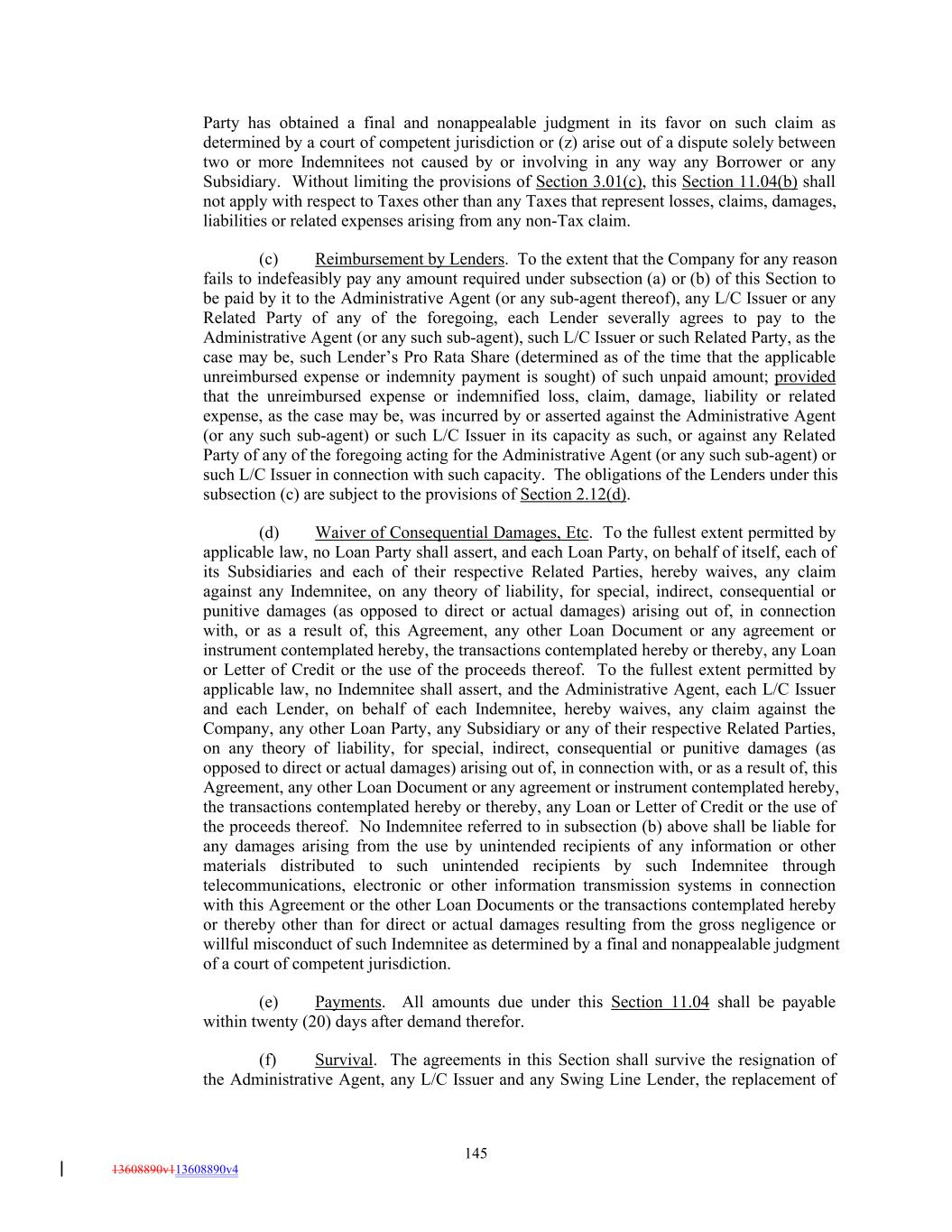 Party has obtained a final and nonappealable judgment in its favor on such claim as determined by a court of competent jurisdiction or (z) arise out of a dispute solely between two or more Indemnitees not caused by or involving in any way any Borrower or any Subsidiary. Without limiting the provisions of Section 3.01(c), this Section 11.04(b) shall not apply with respect to Taxes other than any Taxes that represent losses, claims, damages, liabilities or related expenses arising from any non-Tax claim. (c) Reimbursement by Lenders. To the extent that the Company for any reason fails to indefeasibly pay any amount required under subsection (a) or (b) of this Section to be paid by it to the Administrative Agent (or any sub-agent thereof), any L/C Issuer or any Related Party of any of the foregoing, each Lender severally agrees to pay to the Administrative Agent (or any such sub-agent), such L/C Issuer or such Related Party, as the case may be, such Lender’s Pro Rata Share (determined as of the time that the applicable unreimbursed expense or indemnity payment is sought) of such unpaid amount; provided that the unreimbursed expense or indemnified loss, claim, damage, liability or related expense, as the case may be, was incurred by or asserted against the Administrative Agent (or any such sub-agent) or such L/C Issuer in its capacity as such, or against any Related Party of any of the foregoing acting for the Administrative Agent (or any such sub-agent) or such L/C Issuer in connection with such capacity. The obligations of the Lenders under this subsection (c) are subject to the provisions of Section 2.12(d). (d) Waiver of Consequential Damages, Etc. To the fullest extent permitted by applicable law, no Loan Party shall assert, and each Loan Party, on behalf of itself, each of its Subsidiaries and each of their respective Related Parties, hereby waives, any claim against any Indemnitee, on any theory of liability, for special, indirect, consequential or punitive damages (as opposed to direct or actual damages) arising out of, in connection with, or as a result of, this Agreement, any other Loan Document or any agreement or instrument contemplated hereby, the transactions contemplated hereby or thereby, any Loan or Letter of Credit or the use of the proceeds thereof. To the fullest extent permitted by applicable law, no Indemnitee shall assert, and the Administrative Agent, each L/C Issuer and each Lender, on behalf of each Indemnitee, hereby waives, any claim against the Company, any other Loan Party, any Subsidiary or any of their respective Related Parties, on any theory of liability, for special, indirect, consequential or punitive damages (as opposed to direct or actual damages) arising out of, in connection with, or as a result of, this Agreement, any other Loan Document or any agreement or instrument contemplated hereby, the transactions contemplated hereby or thereby, any Loan or Letter of Credit or the use of the proceeds thereof. No Indemnitee referred to in subsection (b) above shall be liable for any damages arising from the use by unintended recipients of any information or other materials distributed to such unintended recipients by such Indemnitee through telecommunications, electronic or other information transmission systems in connection with this Agreement or the other Loan Documents or the transactions contemplated hereby or thereby other than for direct or actual damages resulting from the gross negligence or willful misconduct of such Indemnitee as determined by a final and nonappealable judgment of a court of competent jurisdiction. (e) Payments. All amounts due under this Section 11.04 shall be payable within twenty (20) days after demand therefor. (f) Survival. The agreements in this Section shall survive the resignation of the Administrative Agent, any L/C Issuer and any Swing Line Lender, the replacement of 145 13608890v113608890v4