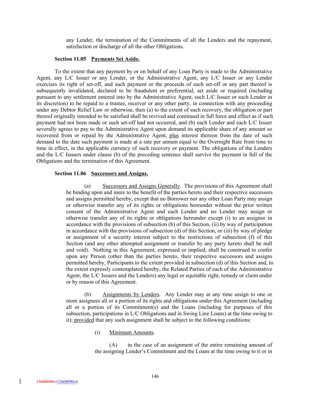 any Lender, the termination of the Commitments of all the Lenders and the repayment, satisfaction or discharge of all the other Obligations. Section 11.05 Payments Set Aside. To the extent that any payment by or on behalf of any Loan Party is made to the Administrative Agent, any L/C Issuer or any Lender, or the Administrative Agent, any L/C Issuer or any Lender exercises its right of set-off, and such payment or the proceeds of such set-off or any part thereof is subsequently invalidated, declared to be fraudulent or preferential, set aside or required (including pursuant to any settlement entered into by the Administrative Agent, such L/C Issuer or such Lender in its discretion) to be repaid to a trustee, receiver or any other party, in connection with any proceeding under any Debtor Relief Law or otherwise, then (a) to the extent of such recovery, the obligation or part thereof originally intended to be satisfied shall be revived and continued in full force and effect as if such payment had not been made or such set-off had not occurred, and (b) each Lender and each L/C Issuer severally agrees to pay to the Administrative Agent upon demand its applicable share of any amount so recovered from or repaid by the Administrative Agent, plus interest thereon from the date of such demand to the date such payment is made at a rate per annum equal to the Overnight Rate from time to time in effect, in the applicable currency of such recovery or payment. The obligations of the Lenders and the L/C Issuers under clause (b) of the preceding sentence shall survive the payment in full of the Obligations and the termination of this Agreement. Section 11.06 Successors and Assigns. (a) Successors and Assigns Generally. The provisions of this Agreement shall be binding upon and inure to the benefit of the parties hereto and their respective successors and assigns permitted hereby, except that no Borrower nor any other Loan Party may assign or otherwise transfer any of its rights or obligations hereunder without the prior written consent of the Administrative Agent and each Lender and no Lender may assign or otherwise transfer any of its rights or obligations hereunder except (i) to an assignee in accordance with the provisions of subsection (b) of this Section, (ii) by way of participation in accordance with the provisions of subsection (d) of this Section, or (iii) by way of pledge or assignment of a security interest subject to the restrictions of subsection (f) of this Section (and any other attempted assignment or transfer by any party hereto shall be null and void). Nothing in this Agreement, expressed or implied, shall be construed to confer upon any Person (other than the parties hereto, their respective successors and assigns permitted hereby, Participants to the extent provided in subsection (d) of this Section and, to the extent expressly contemplated hereby, the Related Parties of each of the Administrative Agent, the L/C Issuers and the Lenders) any legal or equitable right, remedy or claim under or by reason of this Agreement. (b) Assignments by Lenders. Any Lender may at any time assign to one or more assignees all or a portion of its rights and obligations under this Agreement (including all or a portion of its Commitment(s) and the Loans (including for purposes of this subsection, participations in L/C Obligations and in Swing Line Loans) at the time owing to it); provided that any such assignment shall be subject to the following conditions: (i) Minimum Amounts. (A) in the case of an assignment of the entire remaining amount of the assigning Lender’s Commitment and the Loans at the time owing to it or in 146 13608890v113608890v4