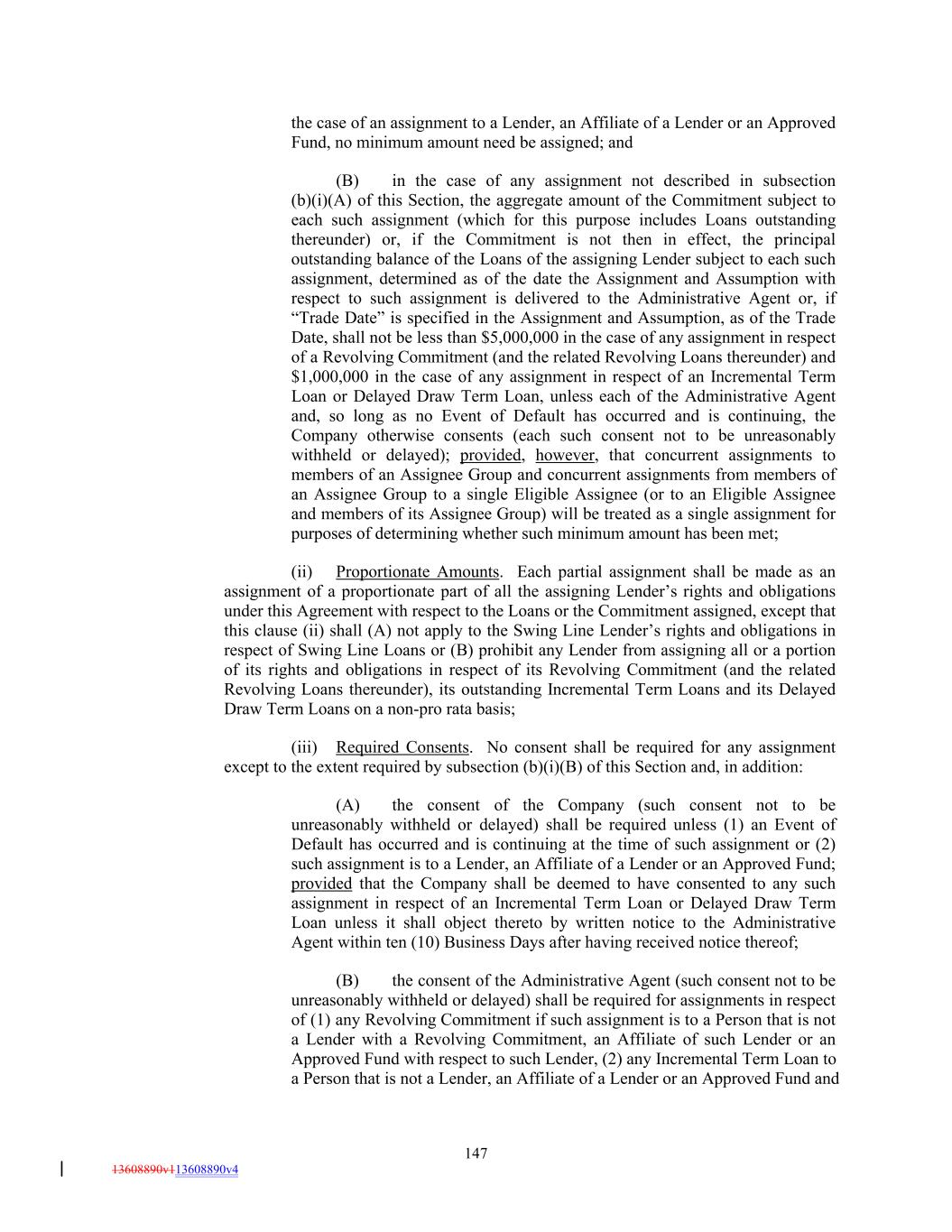 the case of an assignment to a Lender, an Affiliate of a Lender or an Approved Fund, no minimum amount need be assigned; and (B) in the case of any assignment not described in subsection (b)(i)(A) of this Section, the aggregate amount of the Commitment subject to each such assignment (which for this purpose includes Loans outstanding thereunder) or, if the Commitment is not then in effect, the principal outstanding balance of the Loans of the assigning Lender subject to each such assignment, determined as of the date the Assignment and Assumption with respect to such assignment is delivered to the Administrative Agent or, if “Trade Date” is specified in the Assignment and Assumption, as of the Trade Date, shall not be less than $5,000,000 in the case of any assignment in respect of a Revolving Commitment (and the related Revolving Loans thereunder) and $1,000,000 in the case of any assignment in respect of an Incremental Term Loan or Delayed Draw Term Loan, unless each of the Administrative Agent and, so long as no Event of Default has occurred and is continuing, the Company otherwise consents (each such consent not to be unreasonably withheld or delayed); provided, however, that concurrent assignments to members of an Assignee Group and concurrent assignments from members of an Assignee Group to a single Eligible Assignee (or to an Eligible Assignee and members of its Assignee Group) will be treated as a single assignment for purposes of determining whether such minimum amount has been met; (ii) Proportionate Amounts. Each partial assignment shall be made as an assignment of a proportionate part of all the assigning Lender’s rights and obligations under this Agreement with respect to the Loans or the Commitment assigned, except that this clause (ii) shall (A) not apply to the Swing Line Lender’s rights and obligations in respect of Swing Line Loans or (B) prohibit any Lender from assigning all or a portion of its rights and obligations in respect of its Revolving Commitment (and the related Revolving Loans thereunder), its outstanding Incremental Term Loans and its Delayed Draw Term Loans on a non-pro rata basis; (iii) Required Consents. No consent shall be required for any assignment except to the extent required by subsection (b)(i)(B) of this Section and, in addition: (A) the consent of the Company (such consent not to be unreasonably withheld or delayed) shall be required unless (1) an Event of Default has occurred and is continuing at the time of such assignment or (2) such assignment is to a Lender, an Affiliate of a Lender or an Approved Fund; provided that the Company shall be deemed to have consented to any such assignment in respect of an Incremental Term Loan or Delayed Draw Term Loan unless it shall object thereto by written notice to the Administrative Agent within ten (10) Business Days after having received notice thereof; (B) the consent of the Administrative Agent (such consent not to be unreasonably withheld or delayed) shall be required for assignments in respect of (1) any Revolving Commitment if such assignment is to a Person that is not a Lender with a Revolving Commitment, an Affiliate of such Lender or an Approved Fund with respect to such Lender, (2) any Incremental Term Loan to a Person that is not a Lender, an Affiliate of a Lender or an Approved Fund and 147 13608890v113608890v4