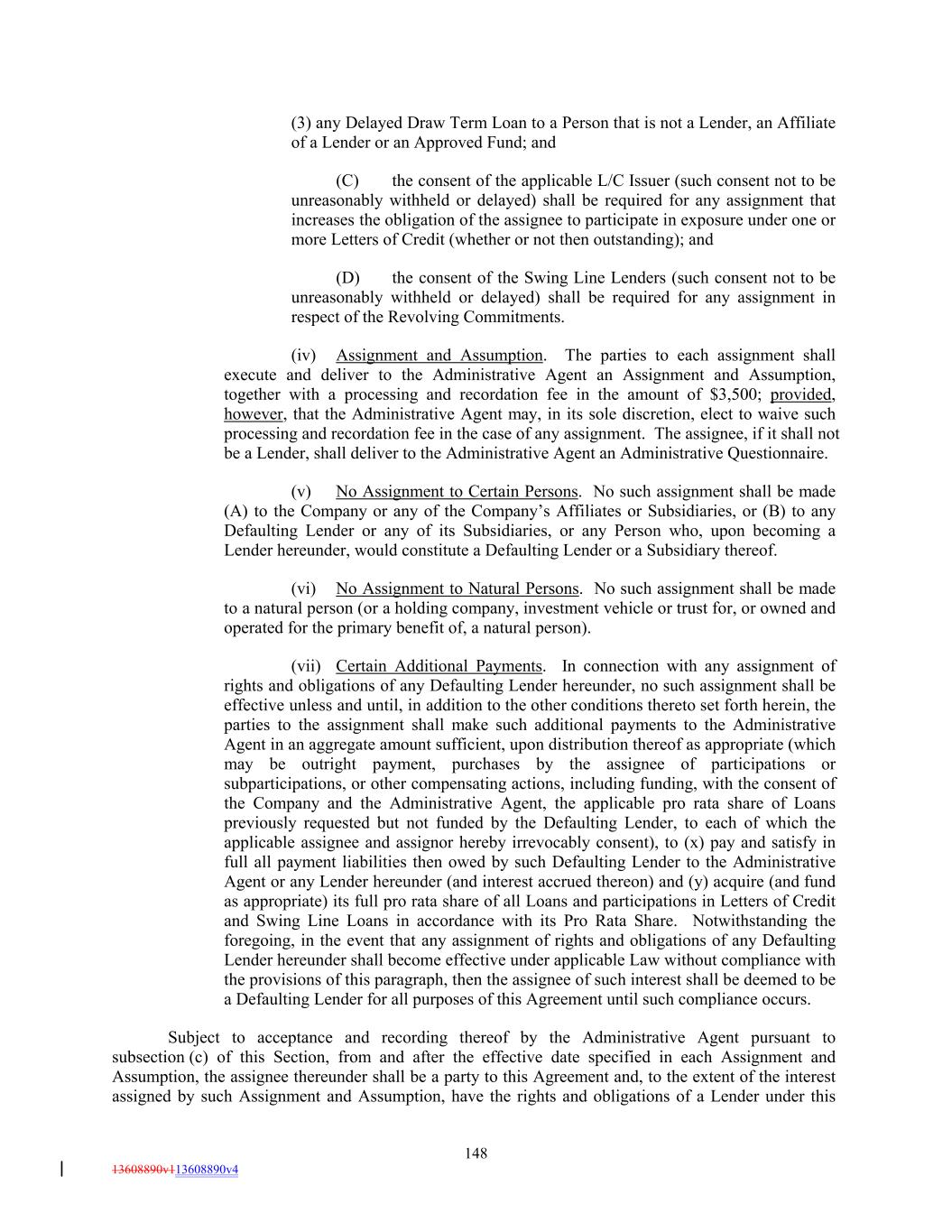 (3) any Delayed Draw Term Loan to a Person that is not a Lender, an Affiliate of a Lender or an Approved Fund; and (C) the consent of the applicable L/C Issuer (such consent not to be unreasonably withheld or delayed) shall be required for any assignment that increases the obligation of the assignee to participate in exposure under one or more Letters of Credit (whether or not then outstanding); and (D) the consent of the Swing Line Lenders (such consent not to be unreasonably withheld or delayed) shall be required for any assignment in respect of the Revolving Commitments. (iv) Assignment and Assumption. The parties to each assignment shall execute and deliver to the Administrative Agent an Assignment and Assumption, together with a processing and recordation fee in the amount of $3,500; provided, however, that the Administrative Agent may, in its sole discretion, elect to waive such processing and recordation fee in the case of any assignment. The assignee, if it shall not be a Lender, shall deliver to the Administrative Agent an Administrative Questionnaire. (v) No Assignment to Certain Persons. No such assignment shall be made (A) to the Company or any of the Company’s Affiliates or Subsidiaries, or (B) to any Defaulting Lender or any of its Subsidiaries, or any Person who, upon becoming a Lender hereunder, would constitute a Defaulting Lender or a Subsidiary thereof. (vi) No Assignment to Natural Persons. No such assignment shall be made to a natural person (or a holding company, investment vehicle or trust for, or owned and operated for the primary benefit of, a natural person). (vii) Certain Additional Payments. In connection with any assignment of rights and obligations of any Defaulting Lender hereunder, no such assignment shall be effective unless and until, in addition to the other conditions thereto set forth herein, the parties to the assignment shall make such additional payments to the Administrative Agent in an aggregate amount sufficient, upon distribution thereof as appropriate (which may be outright payment, purchases by the assignee of participations or subparticipations, or other compensating actions, including funding, with the consent of the Company and the Administrative Agent, the applicable pro rata share of Loans previously requested but not funded by the Defaulting Lender, to each of which the applicable assignee and assignor hereby irrevocably consent), to (x) pay and satisfy in full all payment liabilities then owed by such Defaulting Lender to the Administrative Agent or any Lender hereunder (and interest accrued thereon) and (y) acquire (and fund as appropriate) its full pro rata share of all Loans and participations in Letters of Credit and Swing Line Loans in accordance with its Pro Rata Share. Notwithstanding the foregoing, in the event that any assignment of rights and obligations of any Defaulting Lender hereunder shall become effective under applicable Law without compliance with the provisions of this paragraph, then the assignee of such interest shall be deemed to be a Defaulting Lender for all purposes of this Agreement until such compliance occurs. Subject to acceptance and recording thereof by the Administrative Agent pursuant to subsection (c) of this Section, from and after the effective date specified in each Assignment and Assumption, the assignee thereunder shall be a party to this Agreement and, to the extent of the interest assigned by such Assignment and Assumption, have the rights and obligations of a Lender under this 148 13608890v113608890v4