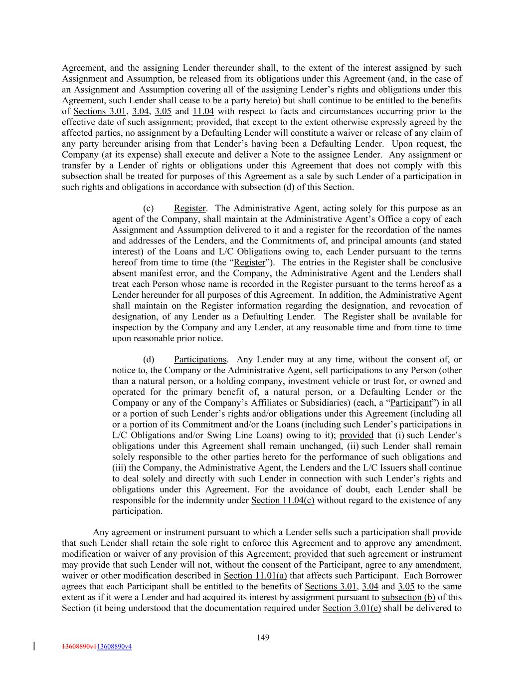 Agreement, and the assigning Lender thereunder shall, to the extent of the interest assigned by such Assignment and Assumption, be released from its obligations under this Agreement (and, in the case of an Assignment and Assumption covering all of the assigning Lender’s rights and obligations under this Agreement, such Lender shall cease to be a party hereto) but shall continue to be entitled to the benefits of Sections 3.01, 3.04, 3.05 and 11.04 with respect to facts and circumstances occurring prior to the effective date of such assignment; provided, that except to the extent otherwise expressly agreed by the affected parties, no assignment by a Defaulting Lender will constitute a waiver or release of any claim of any party hereunder arising from that Lender’s having been a Defaulting Lender. Upon request, the Company (at its expense) shall execute and deliver a Note to the assignee Lender. Any assignment or transfer by a Lender of rights or obligations under this Agreement that does not comply with this subsection shall be treated for purposes of this Agreement as a sale by such Lender of a participation in such rights and obligations in accordance with subsection (d) of this Section. (c) Register. The Administrative Agent, acting solely for this purpose as an agent of the Company, shall maintain at the Administrative Agent’s Office a copy of each Assignment and Assumption delivered to it and a register for the recordation of the names and addresses of the Lenders, and the Commitments of, and principal amounts (and stated interest) of the Loans and L/C Obligations owing to, each Lender pursuant to the terms hereof from time to time (the “Register”). The entries in the Register shall be conclusive absent manifest error, and the Company, the Administrative Agent and the Lenders shall treat each Person whose name is recorded in the Register pursuant to the terms hereof as a Lender hereunder for all purposes of this Agreement. In addition, the Administrative Agent shall maintain on the Register information regarding the designation, and revocation of designation, of any Lender as a Defaulting Lender. The Register shall be available for inspection by the Company and any Lender, at any reasonable time and from time to time upon reasonable prior notice. (d) Participations. Any Lender may at any time, without the consent of, or notice to, the Company or the Administrative Agent, sell participations to any Person (other than a natural person, or a holding company, investment vehicle or trust for, or owned and operated for the primary benefit of, a natural person, or a Defaulting Lender or the Company or any of the Company’s Affiliates or Subsidiaries) (each, a “Participant”) in all or a portion of such Lender’s rights and/or obligations under this Agreement (including all or a portion of its Commitment and/or the Loans (including such Lender’s participations in L/C Obligations and/or Swing Line Loans) owing to it); provided that (i) such Lender’s obligations under this Agreement shall remain unchanged, (ii) such Lender shall remain solely responsible to the other parties hereto for the performance of such obligations and (iii) the Company, the Administrative Agent, the Lenders and the L/C Issuers shall continue to deal solely and directly with such Lender in connection with such Lender’s rights and obligations under this Agreement. For the avoidance of doubt, each Lender shall be responsible for the indemnity under Section 11.04(c) without regard to the existence of any participation. Any agreement or instrument pursuant to which a Lender sells such a participation shall provide that such Lender shall retain the sole right to enforce this Agreement and to approve any amendment, modification or waiver of any provision of this Agreement; provided that such agreement or instrument may provide that such Lender will not, without the consent of the Participant, agree to any amendment, waiver or other modification described in Section 11.01(a) that affects such Participant. Each Borrower agrees that each Participant shall be entitled to the benefits of Sections 3.01, 3.04 and 3.05 to the same extent as if it were a Lender and had acquired its interest by assignment pursuant to subsection (b) of this Section (it being understood that the documentation required under Section 3.01(e) shall be delivered to 149 13608890v113608890v4