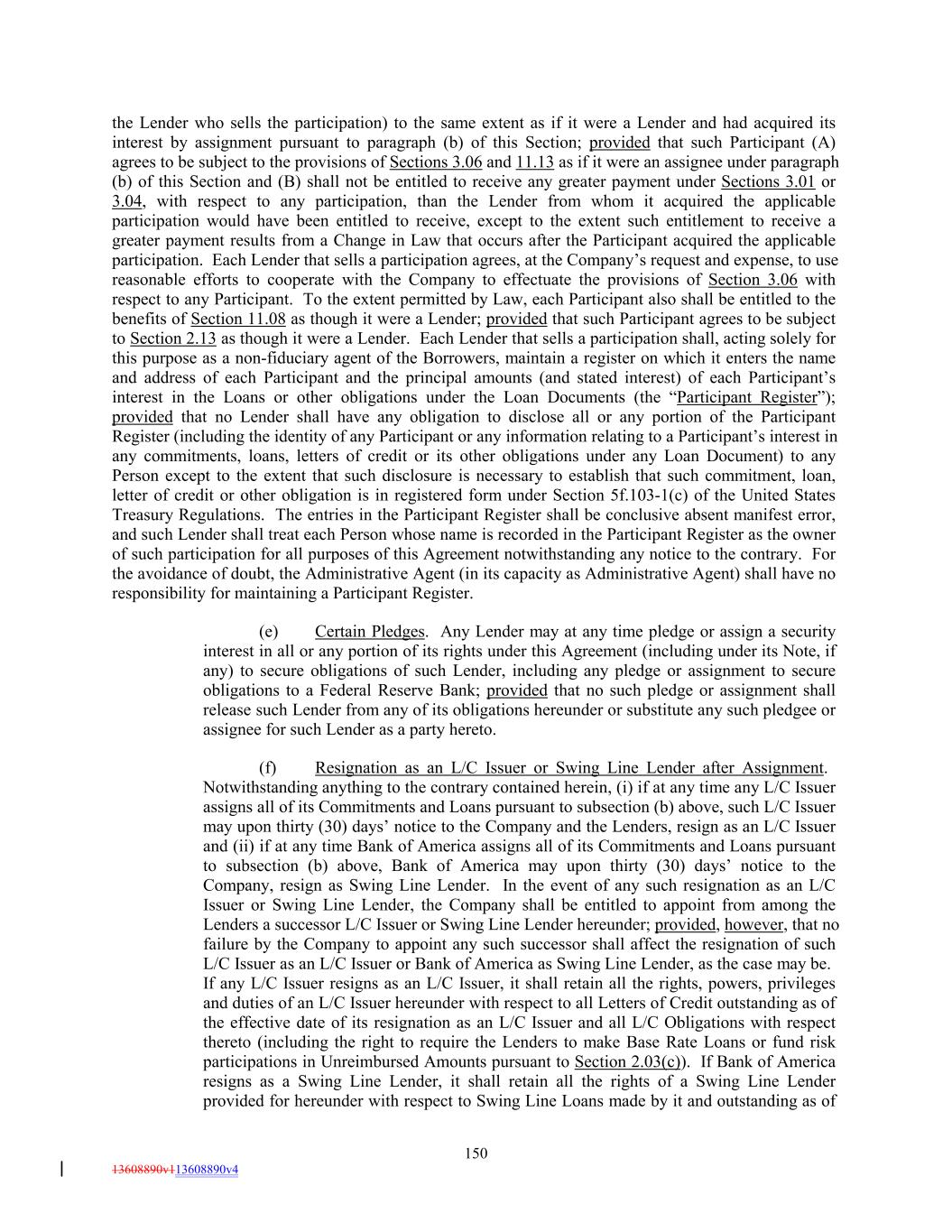 the Lender who sells the participation) to the same extent as if it were a Lender and had acquired its interest by assignment pursuant to paragraph (b) of this Section; provided that such Participant (A) agrees to be subject to the provisions of Sections 3.06 and 11.13 as if it were an assignee under paragraph (b) of this Section and (B) shall not be entitled to receive any greater payment under Sections 3.01 or 3.04, with respect to any participation, than the Lender from whom it acquired the applicable participation would have been entitled to receive, except to the extent such entitlement to receive a greater payment results from a Change in Law that occurs after the Participant acquired the applicable participation. Each Lender that sells a participation agrees, at the Company’s request and expense, to use reasonable efforts to cooperate with the Company to effectuate the provisions of Section 3.06 with respect to any Participant. To the extent permitted by Law, each Participant also shall be entitled to the benefits of Section 11.08 as though it were a Lender; provided that such Participant agrees to be subject to Section 2.13 as though it were a Lender. Each Lender that sells a participation shall, acting solely for this purpose as a non-fiduciary agent of the Borrowers, maintain a register on which it enters the name and address of each Participant and the principal amounts (and stated interest) of each Participant’s interest in the Loans or other obligations under the Loan Documents (the “Participant Register”); provided that no Lender shall have any obligation to disclose all or any portion of the Participant Register (including the identity of any Participant or any information relating to a Participant’s interest in any commitments, loans, letters of credit or its other obligations under any Loan Document) to any Person except to the extent that such disclosure is necessary to establish that such commitment, loan, letter of credit or other obligation is in registered form under Section 5f.103-1(c) of the United States Treasury Regulations. The entries in the Participant Register shall be conclusive absent manifest error, and such Lender shall treat each Person whose name is recorded in the Participant Register as the owner of such participation for all purposes of this Agreement notwithstanding any notice to the contrary. For the avoidance of doubt, the Administrative Agent (in its capacity as Administrative Agent) shall have no responsibility for maintaining a Participant Register. (e) Certain Pledges. Any Lender may at any time pledge or assign a security interest in all or any portion of its rights under this Agreement (including under its Note, if any) to secure obligations of such Lender, including any pledge or assignment to secure obligations to a Federal Reserve Bank; provided that no such pledge or assignment shall release such Lender from any of its obligations hereunder or substitute any such pledgee or assignee for such Lender as a party hereto. (f) Resignation as an L/C Issuer or Swing Line Lender after Assignment. Notwithstanding anything to the contrary contained herein, (i) if at any time any L/C Issuer assigns all of its Commitments and Loans pursuant to subsection (b) above, such L/C Issuer may upon thirty (30) days’ notice to the Company and the Lenders, resign as an L/C Issuer and (ii) if at any time Bank of America assigns all of its Commitments and Loans pursuant to subsection (b) above, Bank of America may upon thirty (30) days’ notice to the Company, resign as Swing Line Lender. In the event of any such resignation as an L/C Issuer or Swing Line Lender, the Company shall be entitled to appoint from among the Lenders a successor L/C Issuer or Swing Line Lender hereunder; provided, however, that no failure by the Company to appoint any such successor shall affect the resignation of such L/C Issuer as an L/C Issuer or Bank of America as Swing Line Lender, as the case may be. If any L/C Issuer resigns as an L/C Issuer, it shall retain all the rights, powers, privileges and duties of an L/C Issuer hereunder with respect to all Letters of Credit outstanding as of the effective date of its resignation as an L/C Issuer and all L/C Obligations with respect thereto (including the right to require the Lenders to make Base Rate Loans or fund risk participations in Unreimbursed Amounts pursuant to Section 2.03(c)). If Bank of America resigns as a Swing Line Lender, it shall retain all the rights of a Swing Line Lender provided for hereunder with respect to Swing Line Loans made by it and outstanding as of 150 13608890v113608890v4