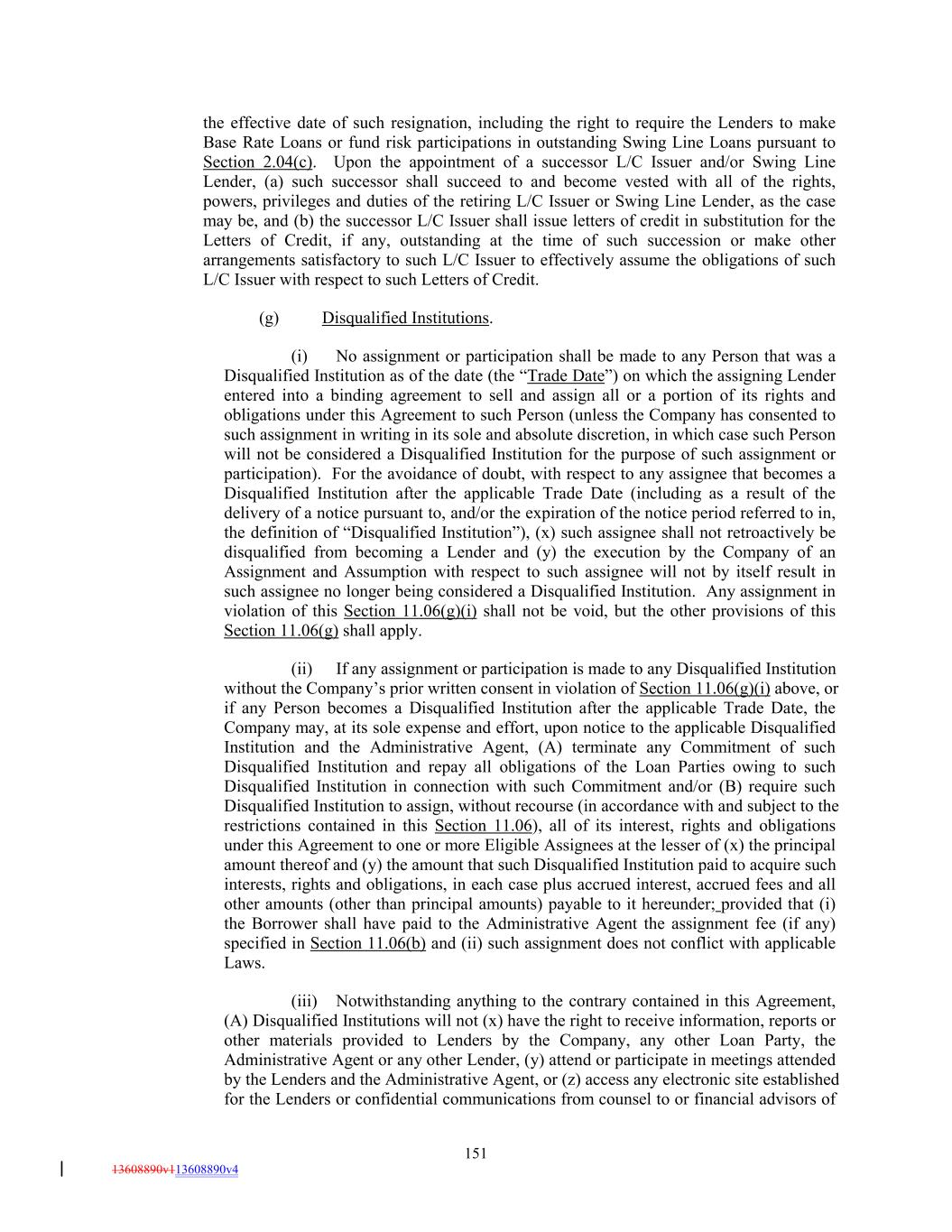 the effective date of such resignation, including the right to require the Lenders to make Base Rate Loans or fund risk participations in outstanding Swing Line Loans pursuant to Section 2.04(c). Upon the appointment of a successor L/C Issuer and/or Swing Line Lender, (a) such successor shall succeed to and become vested with all of the rights, powers, privileges and duties of the retiring L/C Issuer or Swing Line Lender, as the case may be, and (b) the successor L/C Issuer shall issue letters of credit in substitution for the Letters of Credit, if any, outstanding at the time of such succession or make other arrangements satisfactory to such L/C Issuer to effectively assume the obligations of such L/C Issuer with respect to such Letters of Credit. (g) Disqualified Institutions. (i) No assignment or participation shall be made to any Person that was a Disqualified Institution as of the date (the “Trade Date”) on which the assigning Lender entered into a binding agreement to sell and assign all or a portion of its rights and obligations under this Agreement to such Person (unless the Company has consented to such assignment in writing in its sole and absolute discretion, in which case such Person will not be considered a Disqualified Institution for the purpose of such assignment or participation). For the avoidance of doubt, with respect to any assignee that becomes a Disqualified Institution after the applicable Trade Date (including as a result of the delivery of a notice pursuant to, and/or the expiration of the notice period referred to in, the definition of “Disqualified Institution”), (x) such assignee shall not retroactively be disqualified from becoming a Lender and (y) the execution by the Company of an Assignment and Assumption with respect to such assignee will not by itself result in such assignee no longer being considered a Disqualified Institution. Any assignment in violation of this Section 11.06(g)(i) shall not be void, but the other provisions of this Section 11.06(g) shall apply. (ii) If any assignment or participation is made to any Disqualified Institution without the Company’s prior written consent in violation of Section 11.06(g)(i) above, or if any Person becomes a Disqualified Institution after the applicable Trade Date, the Company may, at its sole expense and effort, upon notice to the applicable Disqualified Institution and the Administrative Agent, (A) terminate any Commitment of such Disqualified Institution and repay all obligations of the Loan Parties owing to such Disqualified Institution in connection with such Commitment and/or (B) require such Disqualified Institution to assign, without recourse (in accordance with and subject to the restrictions contained in this Section 11.06), all of its interest, rights and obligations under this Agreement to one or more Eligible Assignees at the lesser of (x) the principal amount thereof and (y) the amount that such Disqualified Institution paid to acquire such interests, rights and obligations, in each case plus accrued interest, accrued fees and all other amounts (other than principal amounts) payable to it hereunder; provided that (i) the Borrower shall have paid to the Administrative Agent the assignment fee (if any) specified in Section 11.06(b) and (ii) such assignment does not conflict with applicable Laws. (iii) Notwithstanding anything to the contrary contained in this Agreement, (A) Disqualified Institutions will not (x) have the right to receive information, reports or other materials provided to Lenders by the Company, any other Loan Party, the Administrative Agent or any other Lender, (y) attend or participate in meetings attended by the Lenders and the Administrative Agent, or (z) access any electronic site established for the Lenders or confidential communications from counsel to or financial advisors of 151 13608890v113608890v4