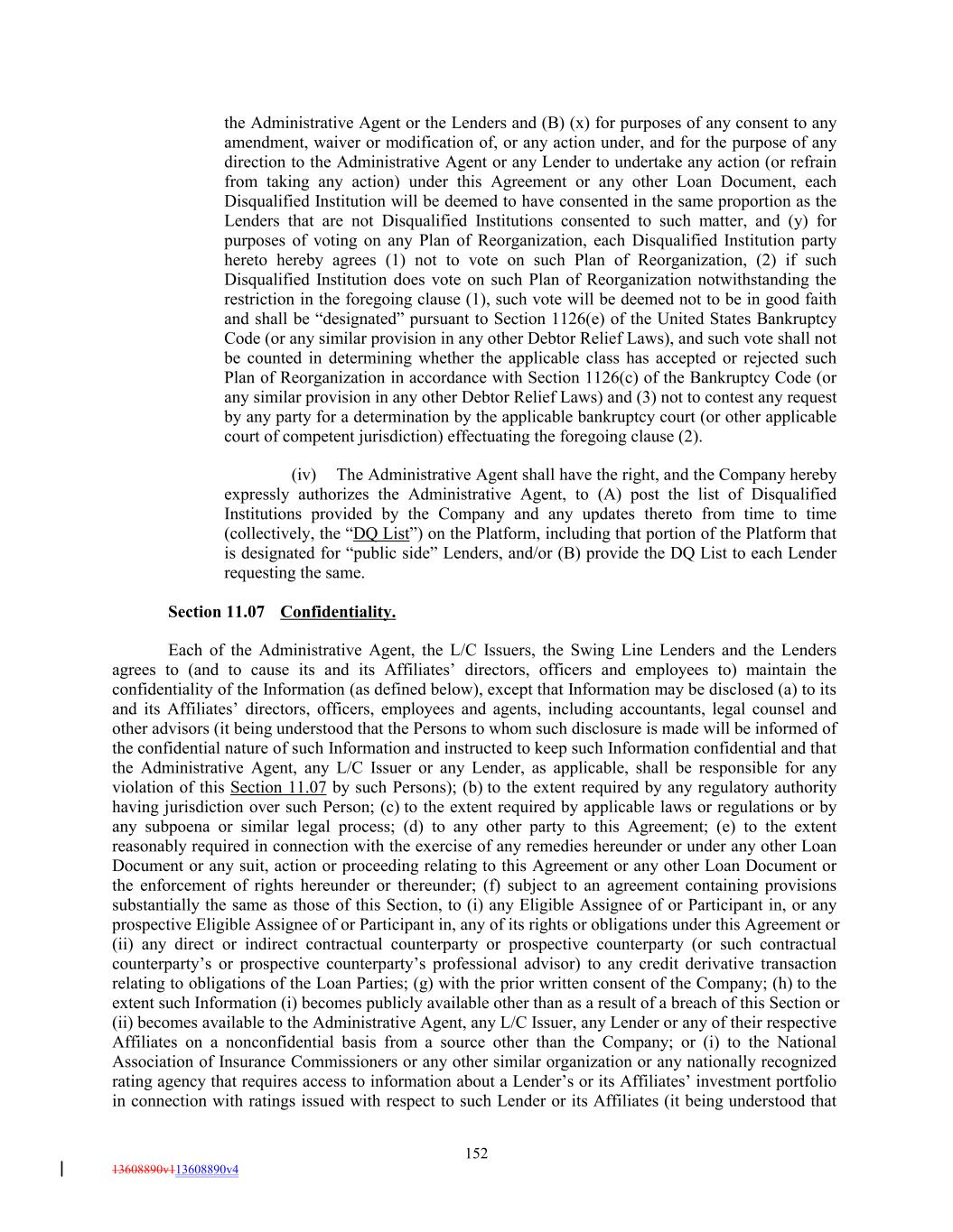 the Administrative Agent or the Lenders and (B) (x) for purposes of any consent to any amendment, waiver or modification of, or any action under, and for the purpose of any direction to the Administrative Agent or any Lender to undertake any action (or refrain from taking any action) under this Agreement or any other Loan Document, each Disqualified Institution will be deemed to have consented in the same proportion as the Lenders that are not Disqualified Institutions consented to such matter, and (y) for purposes of voting on any Plan of Reorganization, each Disqualified Institution party hereto hereby agrees (1) not to vote on such Plan of Reorganization, (2) if such Disqualified Institution does vote on such Plan of Reorganization notwithstanding the restriction in the foregoing clause (1), such vote will be deemed not to be in good faith and shall be “designated” pursuant to Section 1126(e) of the United States Bankruptcy Code (or any similar provision in any other Debtor Relief Laws), and such vote shall not be counted in determining whether the applicable class has accepted or rejected such Plan of Reorganization in accordance with Section 1126(c) of the Bankruptcy Code (or any similar provision in any other Debtor Relief Laws) and (3) not to contest any request by any party for a determination by the applicable bankruptcy court (or other applicable court of competent jurisdiction) effectuating the foregoing clause (2). (iv) The Administrative Agent shall have the right, and the Company hereby expressly authorizes the Administrative Agent, to (A) post the list of Disqualified Institutions provided by the Company and any updates thereto from time to time (collectively, the “DQ List”) on the Platform, including that portion of the Platform that is designated for “public side” Lenders, and/or (B) provide the DQ List to each Lender requesting the same. Section 11.07 Confidentiality. Each of the Administrative Agent, the L/C Issuers, the Swing Line Lenders and the Lenders agrees to (and to cause its and its Affiliates’ directors, officers and employees to) maintain the confidentiality of the Information (as defined below), except that Information may be disclosed (a) to its and its Affiliates’ directors, officers, employees and agents, including accountants, legal counsel and other advisors (it being understood that the Persons to whom such disclosure is made will be informed of the confidential nature of such Information and instructed to keep such Information confidential and that the Administrative Agent, any L/C Issuer or any Lender, as applicable, shall be responsible for any violation of this Section 11.07 by such Persons); (b) to the extent required by any regulatory authority having jurisdiction over such Person; (c) to the extent required by applicable laws or regulations or by any subpoena or similar legal process; (d) to any other party to this Agreement; (e) to the extent reasonably required in connection with the exercise of any remedies hereunder or under any other Loan Document or any suit, action or proceeding relating to this Agreement or any other Loan Document or the enforcement of rights hereunder or thereunder; (f) subject to an agreement containing provisions substantially the same as those of this Section, to (i) any Eligible Assignee of or Participant in, or any prospective Eligible Assignee of or Participant in, any of its rights or obligations under this Agreement or (ii) any direct or indirect contractual counterparty or prospective counterparty (or such contractual counterparty’s or prospective counterparty’s professional advisor) to any credit derivative transaction relating to obligations of the Loan Parties; (g) with the prior written consent of the Company; (h) to the extent such Information (i) becomes publicly available other than as a result of a breach of this Section or (ii) becomes available to the Administrative Agent, any L/C Issuer, any Lender or any of their respective Affiliates on a nonconfidential basis from a source other than the Company; or (i) to the National Association of Insurance Commissioners or any other similar organization or any nationally recognized rating agency that requires access to information about a Lender’s or its Affiliates’ investment portfolio in connection with ratings issued with respect to such Lender or its Affiliates (it being understood that 152 13608890v113608890v4