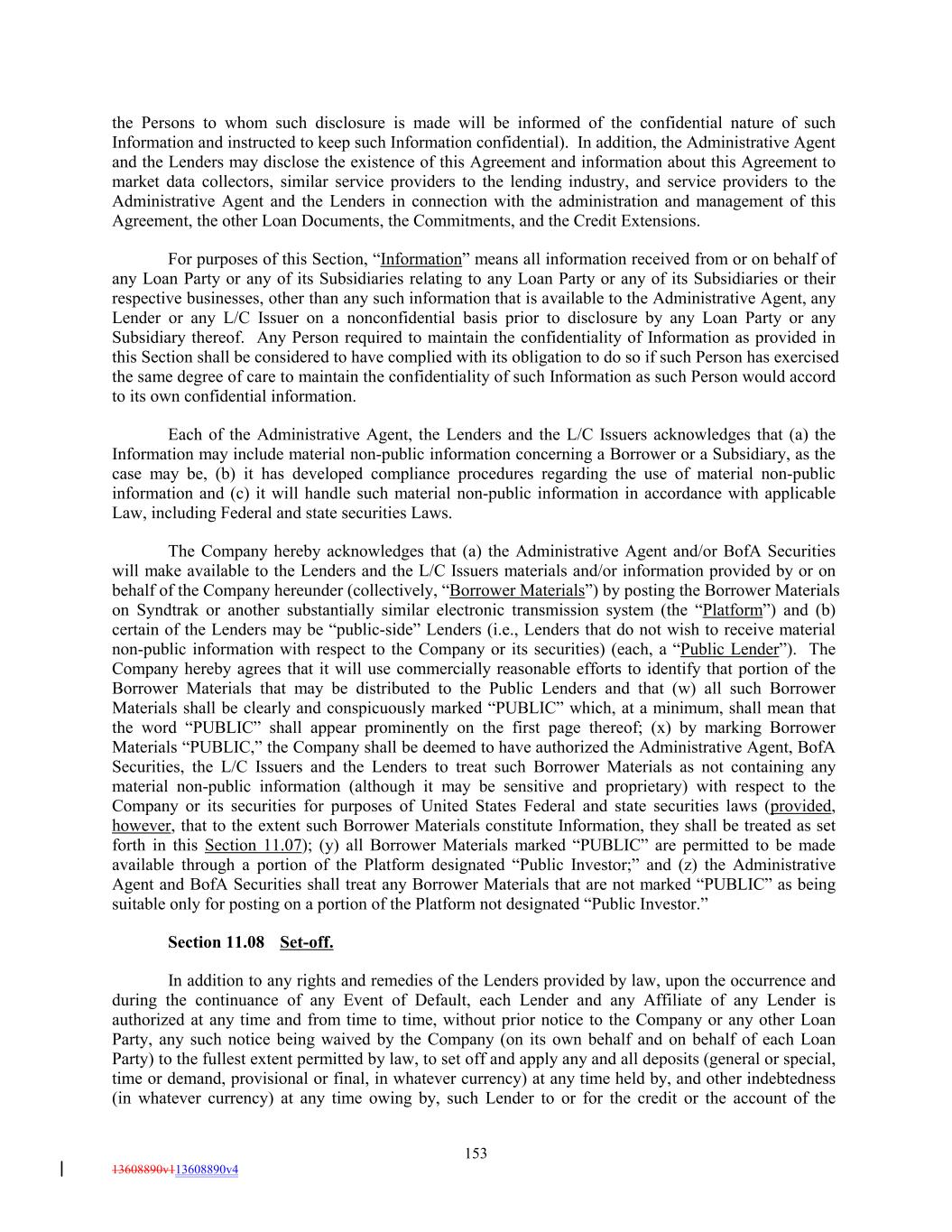 the Persons to whom such disclosure is made will be informed of the confidential nature of such Information and instructed to keep such Information confidential). In addition, the Administrative Agent and the Lenders may disclose the existence of this Agreement and information about this Agreement to market data collectors, similar service providers to the lending industry, and service providers to the Administrative Agent and the Lenders in connection with the administration and management of this Agreement, the other Loan Documents, the Commitments, and the Credit Extensions. For purposes of this Section, “Information” means all information received from or on behalf of any Loan Party or any of its Subsidiaries relating to any Loan Party or any of its Subsidiaries or their respective businesses, other than any such information that is available to the Administrative Agent, any Lender or any L/C Issuer on a nonconfidential basis prior to disclosure by any Loan Party or any Subsidiary thereof. Any Person required to maintain the confidentiality of Information as provided in this Section shall be considered to have complied with its obligation to do so if such Person has exercised the same degree of care to maintain the confidentiality of such Information as such Person would accord to its own confidential information. Each of the Administrative Agent, the Lenders and the L/C Issuers acknowledges that (a) the Information may include material non-public information concerning a Borrower or a Subsidiary, as the case may be, (b) it has developed compliance procedures regarding the use of material non-public information and (c) it will handle such material non-public information in accordance with applicable Law, including Federal and state securities Laws. The Company hereby acknowledges that (a) the Administrative Agent and/or BofA Securities will make available to the Lenders and the L/C Issuers materials and/or information provided by or on behalf of the Company hereunder (collectively, “Borrower Materials”) by posting the Borrower Materials on Syndtrak or another substantially similar electronic transmission system (the “Platform”) and (b) certain of the Lenders may be “public-side” Lenders (i.e., Lenders that do not wish to receive material non-public information with respect to the Company or its securities) (each, a “Public Lender”). The Company hereby agrees that it will use commercially reasonable efforts to identify that portion of the Borrower Materials that may be distributed to the Public Lenders and that (w) all such Borrower Materials shall be clearly and conspicuously marked “PUBLIC” which, at a minimum, shall mean that the word “PUBLIC” shall appear prominently on the first page thereof; (x) by marking Borrower Materials “PUBLIC,” the Company shall be deemed to have authorized the Administrative Agent, BofA Securities, the L/C Issuers and the Lenders to treat such Borrower Materials as not containing any material non-public information (although it may be sensitive and proprietary) with respect to the Company or its securities for purposes of United States Federal and state securities laws (provided, however, that to the extent such Borrower Materials constitute Information, they shall be treated as set forth in this Section 11.07); (y) all Borrower Materials marked “PUBLIC” are permitted to be made available through a portion of the Platform designated “Public Investor;” and (z) the Administrative Agent and BofA Securities shall treat any Borrower Materials that are not marked “PUBLIC” as being suitable only for posting on a portion of the Platform not designated “Public Investor.” Section 11.08 Set-off. In addition to any rights and remedies of the Lenders provided by law, upon the occurrence and during the continuance of any Event of Default, each Lender and any Affiliate of any Lender is authorized at any time and from time to time, without prior notice to the Company or any other Loan Party, any such notice being waived by the Company (on its own behalf and on behalf of each Loan Party) to the fullest extent permitted by law, to set off and apply any and all deposits (general or special, time or demand, provisional or final, in whatever currency) at any time held by, and other indebtedness (in whatever currency) at any time owing by, such Lender to or for the credit or the account of the 153 13608890v113608890v4