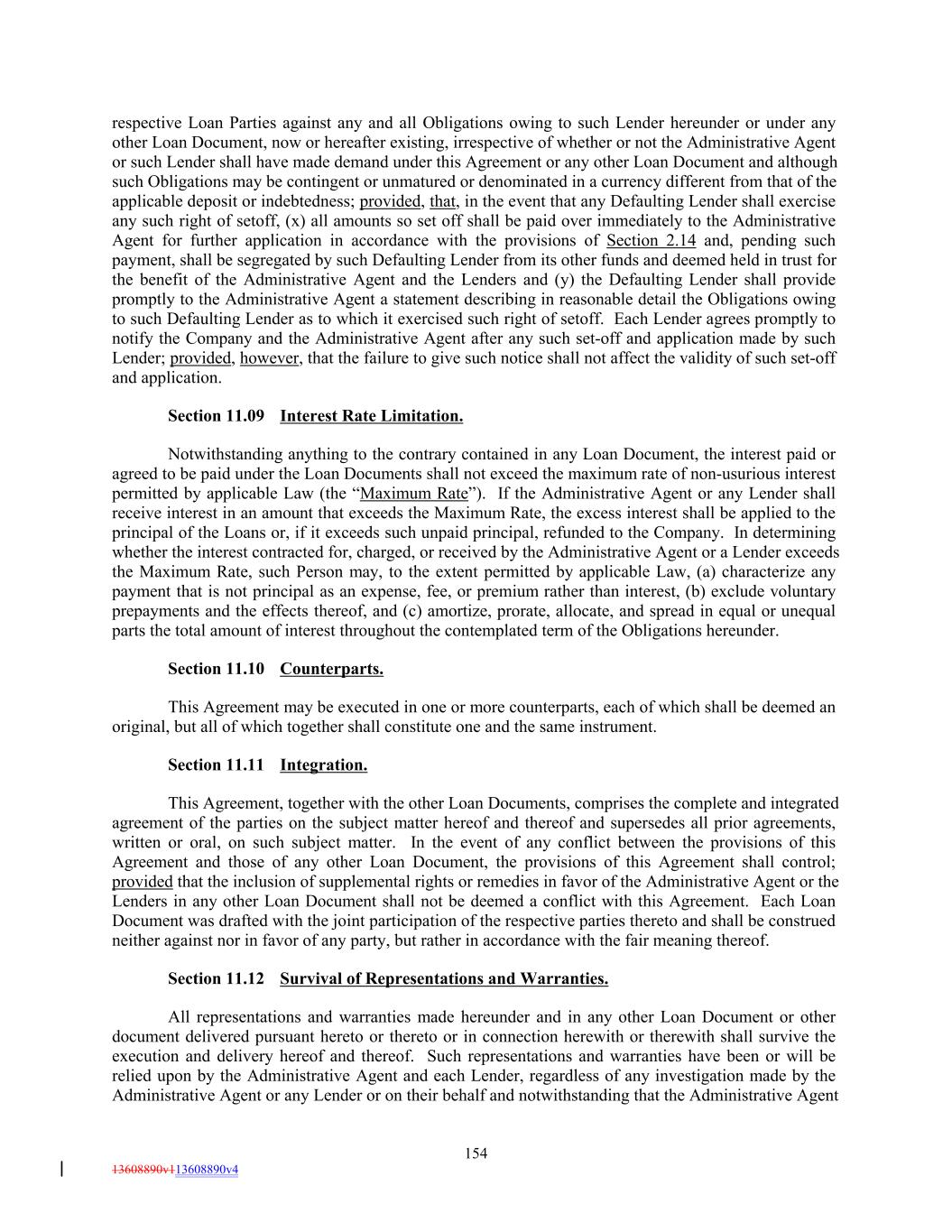 respective Loan Parties against any and all Obligations owing to such Lender hereunder or under any other Loan Document, now or hereafter existing, irrespective of whether or not the Administrative Agent or such Lender shall have made demand under this Agreement or any other Loan Document and although such Obligations may be contingent or unmatured or denominated in a currency different from that of the applicable deposit or indebtedness; provided, that, in the event that any Defaulting Lender shall exercise any such right of setoff, (x) all amounts so set off shall be paid over immediately to the Administrative Agent for further application in accordance with the provisions of Section 2.14 and, pending such payment, shall be segregated by such Defaulting Lender from its other funds and deemed held in trust for the benefit of the Administrative Agent and the Lenders and (y) the Defaulting Lender shall provide promptly to the Administrative Agent a statement describing in reasonable detail the Obligations owing to such Defaulting Lender as to which it exercised such right of setoff. Each Lender agrees promptly to notify the Company and the Administrative Agent after any such set-off and application made by such Lender; provided, however, that the failure to give such notice shall not affect the validity of such set-off and application. Section 11.09 Interest Rate Limitation. Notwithstanding anything to the contrary contained in any Loan Document, the interest paid or agreed to be paid under the Loan Documents shall not exceed the maximum rate of non-usurious interest permitted by applicable Law (the “Maximum Rate”). If the Administrative Agent or any Lender shall receive interest in an amount that exceeds the Maximum Rate, the excess interest shall be applied to the principal of the Loans or, if it exceeds such unpaid principal, refunded to the Company. In determining whether the interest contracted for, charged, or received by the Administrative Agent or a Lender exceeds the Maximum Rate, such Person may, to the extent permitted by applicable Law, (a) characterize any payment that is not principal as an expense, fee, or premium rather than interest, (b) exclude voluntary prepayments and the effects thereof, and (c) amortize, prorate, allocate, and spread in equal or unequal parts the total amount of interest throughout the contemplated term of the Obligations hereunder. Section 11.10 Counterparts. This Agreement may be executed in one or more counterparts, each of which shall be deemed an original, but all of which together shall constitute one and the same instrument. Section 11.11 Integration. This Agreement, together with the other Loan Documents, comprises the complete and integrated agreement of the parties on the subject matter hereof and thereof and supersedes all prior agreements, written or oral, on such subject matter. In the event of any conflict between the provisions of this Agreement and those of any other Loan Document, the provisions of this Agreement shall control; provided that the inclusion of supplemental rights or remedies in favor of the Administrative Agent or the Lenders in any other Loan Document shall not be deemed a conflict with this Agreement. Each Loan Document was drafted with the joint participation of the respective parties thereto and shall be construed neither against nor in favor of any party, but rather in accordance with the fair meaning thereof. Section 11.12 Survival of Representations and Warranties. All representations and warranties made hereunder and in any other Loan Document or other document delivered pursuant hereto or thereto or in connection herewith or therewith shall survive the execution and delivery hereof and thereof. Such representations and warranties have been or will be relied upon by the Administrative Agent and each Lender, regardless of any investigation made by the Administrative Agent or any Lender or on their behalf and notwithstanding that the Administrative Agent 154 13608890v113608890v4