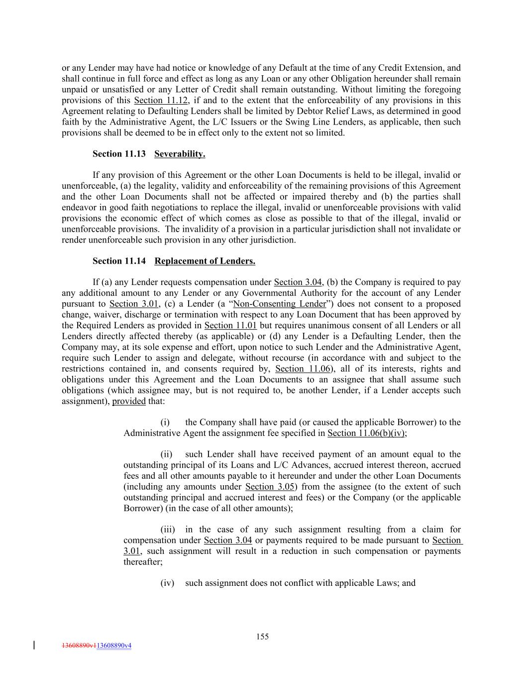 or any Lender may have had notice or knowledge of any Default at the time of any Credit Extension, and shall continue in full force and effect as long as any Loan or any other Obligation hereunder shall remain unpaid or unsatisfied or any Letter of Credit shall remain outstanding. Without limiting the foregoing provisions of this Section 11.12, if and to the extent that the enforceability of any provisions in this Agreement relating to Defaulting Lenders shall be limited by Debtor Relief Laws, as determined in good faith by the Administrative Agent, the L/C Issuers or the Swing Line Lenders, as applicable, then such provisions shall be deemed to be in effect only to the extent not so limited. Section 11.13 Severability. If any provision of this Agreement or the other Loan Documents is held to be illegal, invalid or unenforceable, (a) the legality, validity and enforceability of the remaining provisions of this Agreement and the other Loan Documents shall not be affected or impaired thereby and (b) the parties shall endeavor in good faith negotiations to replace the illegal, invalid or unenforceable provisions with valid provisions the economic effect of which comes as close as possible to that of the illegal, invalid or unenforceable provisions. The invalidity of a provision in a particular jurisdiction shall not invalidate or render unenforceable such provision in any other jurisdiction. Section 11.14 Replacement of Lenders. If (a) any Lender requests compensation under Section 3.04, (b) the Company is required to pay any additional amount to any Lender or any Governmental Authority for the account of any Lender pursuant to Section 3.01, (c) a Lender (a “Non-Consenting Lender”) does not consent to a proposed change, waiver, discharge or termination with respect to any Loan Document that has been approved by the Required Lenders as provided in Section 11.01 but requires unanimous consent of all Lenders or all Lenders directly affected thereby (as applicable) or (d) any Lender is a Defaulting Lender, then the Company may, at its sole expense and effort, upon notice to such Lender and the Administrative Agent, require such Lender to assign and delegate, without recourse (in accordance with and subject to the restrictions contained in, and consents required by, Section 11.06), all of its interests, rights and obligations under this Agreement and the Loan Documents to an assignee that shall assume such obligations (which assignee may, but is not required to, be another Lender, if a Lender accepts such assignment), provided that: (i) the Company shall have paid (or caused the applicable Borrower) to the Administrative Agent the assignment fee specified in Section 11.06(b)(iv); (ii) such Lender shall have received payment of an amount equal to the outstanding principal of its Loans and L/C Advances, accrued interest thereon, accrued fees and all other amounts payable to it hereunder and under the other Loan Documents (including any amounts under Section 3.05) from the assignee (to the extent of such outstanding principal and accrued interest and fees) or the Company (or the applicable Borrower) (in the case of all other amounts); (iii) in the case of any such assignment resulting from a claim for compensation under Section 3.04 or payments required to be made pursuant to Section 3.01, such assignment will result in a reduction in such compensation or payments thereafter; (iv) such assignment does not conflict with applicable Laws; and 155 13608890v113608890v4
