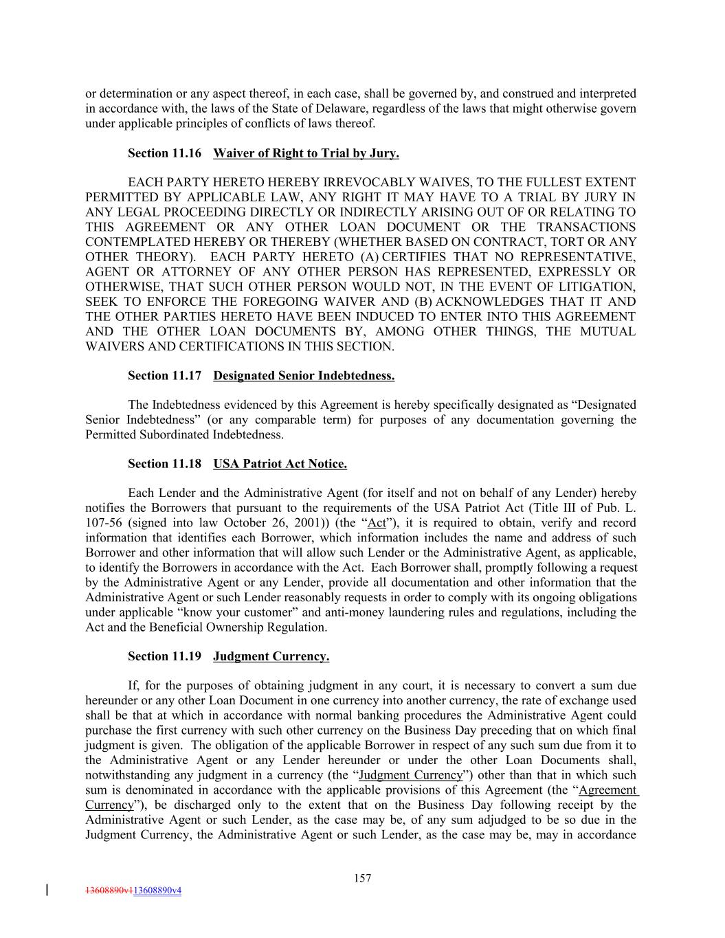 or determination or any aspect thereof, in each case, shall be governed by, and construed and interpreted in accordance with, the laws of the State of Delaware, regardless of the laws that might otherwise govern under applicable principles of conflicts of laws thereof. Section 11.16 Waiver of Right to Trial by Jury. EACH PARTY HERETO HEREBY IRREVOCABLY WAIVES, TO THE FULLEST EXTENT PERMITTED BY APPLICABLE LAW, ANY RIGHT IT MAY HAVE TO A TRIAL BY JURY IN ANY LEGAL PROCEEDING DIRECTLY OR INDIRECTLY ARISING OUT OF OR RELATING TO THIS AGREEMENT OR ANY OTHER LOAN DOCUMENT OR THE TRANSACTIONS CONTEMPLATED HEREBY OR THEREBY (WHETHER BASED ON CONTRACT, TORT OR ANY OTHER THEORY). EACH PARTY HERETO (A) CERTIFIES THAT NO REPRESENTATIVE, AGENT OR ATTORNEY OF ANY OTHER PERSON HAS REPRESENTED, EXPRESSLY OR OTHERWISE, THAT SUCH OTHER PERSON WOULD NOT, IN THE EVENT OF LITIGATION, SEEK TO ENFORCE THE FOREGOING WAIVER AND (B) ACKNOWLEDGES THAT IT AND THE OTHER PARTIES HERETO HAVE BEEN INDUCED TO ENTER INTO THIS AGREEMENT AND THE OTHER LOAN DOCUMENTS BY, AMONG OTHER THINGS, THE MUTUAL WAIVERS AND CERTIFICATIONS IN THIS SECTION. Section 11.17 Designated Senior Indebtedness. The Indebtedness evidenced by this Agreement is hereby specifically designated as “Designated Senior Indebtedness” (or any comparable term) for purposes of any documentation governing the Permitted Subordinated Indebtedness. Section 11.18 USA Patriot Act Notice. Each Lender and the Administrative Agent (for itself and not on behalf of any Lender) hereby notifies the Borrowers that pursuant to the requirements of the USA Patriot Act (Title III of Pub. L. 107-56 (signed into law October 26, 2001)) (the “Act”), it is required to obtain, verify and record information that identifies each Borrower, which information includes the name and address of such Borrower and other information that will allow such Lender or the Administrative Agent, as applicable, to identify the Borrowers in accordance with the Act. Each Borrower shall, promptly following a request by the Administrative Agent or any Lender, provide all documentation and other information that the Administrative Agent or such Lender reasonably requests in order to comply with its ongoing obligations under applicable “know your customer” and anti-money laundering rules and regulations, including the Act and the Beneficial Ownership Regulation. Section 11.19 Judgment Currency. If, for the purposes of obtaining judgment in any court, it is necessary to convert a sum due hereunder or any other Loan Document in one currency into another currency, the rate of exchange used shall be that at which in accordance with normal banking procedures the Administrative Agent could purchase the first currency with such other currency on the Business Day preceding that on which final judgment is given. The obligation of the applicable Borrower in respect of any such sum due from it to the Administrative Agent or any Lender hereunder or under the other Loan Documents shall, notwithstanding any judgment in a currency (the “Judgment Currency”) other than that in which such sum is denominated in accordance with the applicable provisions of this Agreement (the “Agreement Currency”), be discharged only to the extent that on the Business Day following receipt by the Administrative Agent or such Lender, as the case may be, of any sum adjudged to be so due in the Judgment Currency, the Administrative Agent or such Lender, as the case may be, may in accordance 157 13608890v113608890v4