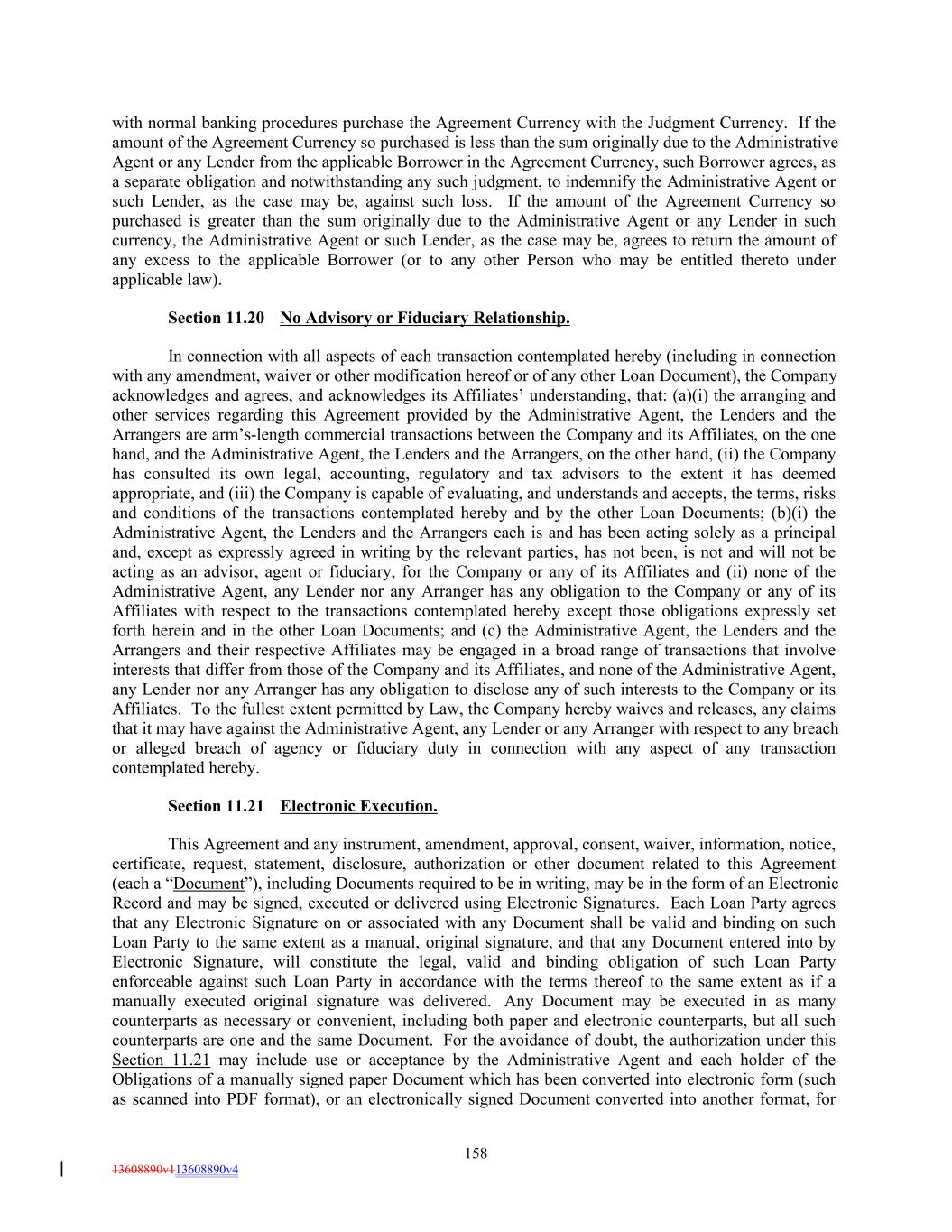 with normal banking procedures purchase the Agreement Currency with the Judgment Currency. If the amount of the Agreement Currency so purchased is less than the sum originally due to the Administrative Agent or any Lender from the applicable Borrower in the Agreement Currency, such Borrower agrees, as a separate obligation and notwithstanding any such judgment, to indemnify the Administrative Agent or such Lender, as the case may be, against such loss. If the amount of the Agreement Currency so purchased is greater than the sum originally due to the Administrative Agent or any Lender in such currency, the Administrative Agent or such Lender, as the case may be, agrees to return the amount of any excess to the applicable Borrower (or to any other Person who may be entitled thereto under applicable law). Section 11.20 No Advisory or Fiduciary Relationship. In connection with all aspects of each transaction contemplated hereby (including in connection with any amendment, waiver or other modification hereof or of any other Loan Document), the Company acknowledges and agrees, and acknowledges its Affiliates’ understanding, that: (a)(i) the arranging and other services regarding this Agreement provided by the Administrative Agent, the Lenders and the Arrangers are arm’s-length commercial transactions between the Company and its Affiliates, on the one hand, and the Administrative Agent, the Lenders and the Arrangers, on the other hand, (ii) the Company has consulted its own legal, accounting, regulatory and tax advisors to the extent it has deemed appropriate, and (iii) the Company is capable of evaluating, and understands and accepts, the terms, risks and conditions of the transactions contemplated hereby and by the other Loan Documents; (b)(i) the Administrative Agent, the Lenders and the Arrangers each is and has been acting solely as a principal and, except as expressly agreed in writing by the relevant parties, has not been, is not and will not be acting as an advisor, agent or fiduciary, for the Company or any of its Affiliates and (ii) none of the Administrative Agent, any Lender nor any Arranger has any obligation to the Company or any of its Affiliates with respect to the transactions contemplated hereby except those obligations expressly set forth herein and in the other Loan Documents; and (c) the Administrative Agent, the Lenders and the Arrangers and their respective Affiliates may be engaged in a broad range of transactions that involve interests that differ from those of the Company and its Affiliates, and none of the Administrative Agent, any Lender nor any Arranger has any obligation to disclose any of such interests to the Company or its Affiliates. To the fullest extent permitted by Law, the Company hereby waives and releases, any claims that it may have against the Administrative Agent, any Lender or any Arranger with respect to any breach or alleged breach of agency or fiduciary duty in connection with any aspect of any transaction contemplated hereby. Section 11.21 Electronic Execution. This Agreement and any instrument, amendment, approval, consent, waiver, information, notice, certificate, request, statement, disclosure, authorization or other document related to this Agreement (each a “Document”), including Documents required to be in writing, may be in the form of an Electronic Record and may be signed, executed or delivered using Electronic Signatures. Each Loan Party agrees that any Electronic Signature on or associated with any Document shall be valid and binding on such Loan Party to the same extent as a manual, original signature, and that any Document entered into by Electronic Signature, will constitute the legal, valid and binding obligation of such Loan Party enforceable against such Loan Party in accordance with the terms thereof to the same extent as if a manually executed original signature was delivered. Any Document may be executed in as many counterparts as necessary or convenient, including both paper and electronic counterparts, but all such counterparts are one and the same Document. For the avoidance of doubt, the authorization under this Section 11.21 may include use or acceptance by the Administrative Agent and each holder of the Obligations of a manually signed paper Document which has been converted into electronic form (such as scanned into PDF format), or an electronically signed Document converted into another format, for 158 13608890v113608890v4