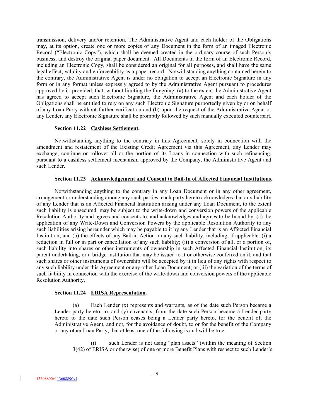 transmission, delivery and/or retention. The Administrative Agent and each holder of the Obligations may, at its option, create one or more copies of any Document in the form of an imaged Electronic Record (“Electronic Copy”), which shall be deemed created in the ordinary course of such Person’s business, and destroy the original paper document. All Documents in the form of an Electronic Record, including an Electronic Copy, shall be considered an original for all purposes, and shall have the same legal effect, validity and enforceability as a paper record. Notwithstanding anything contained herein to the contrary, the Administrative Agent is under no obligation to accept an Electronic Signature in any form or in any format unless expressly agreed to by the Administrative Agent pursuant to procedures approved by it; provided, that, without limiting the foregoing, (a) to the extent the Administrative Agent has agreed to accept such Electronic Signature, the Administrative Agent and each holder of the Obligations shall be entitled to rely on any such Electronic Signature purportedly given by or on behalf of any Loan Party without further verification and (b) upon the request of the Administrative Agent or any Lender, any Electronic Signature shall be promptly followed by such manually executed counterpart. Section 11.22 Cashless Settlement. Notwithstanding anything to the contrary in this Agreement, solely in connection with the amendment and restatement of the Existing Credit Agreement via this Agreement, any Lender may exchange, continue or rollover all or the portion of its Loans in connection with such refinancing, pursuant to a cashless settlement mechanism approved by the Company, the Administrative Agent and such Lender. Section 11.23 Acknowledgement and Consent to Bail-In of Affected Financial Institutions. Notwithstanding anything to the contrary in any Loan Document or in any other agreement, arrangement or understanding among any such parties, each party hereto acknowledges that any liability of any Lender that is an Affected Financial Institution arising under any Loan Document, to the extent such liability is unsecured, may be subject to the write-down and conversion powers of the applicable Resolution Authority and agrees and consents to, and acknowledges and agrees to be bound by: (a) the application of any Write-Down and Conversion Powers by the applicable Resolution Authority to any such liabilities arising hereunder which may be payable to it by any Lender that is an Affected Financial Institution; and (b) the effects of any Bail-in Action on any such liability, including, if applicable: (i) a reduction in full or in part or cancellation of any such liability; (ii) a conversion of all, or a portion of, such liability into shares or other instruments of ownership in such Affected Financial Institution, its parent undertaking, or a bridge institution that may be issued to it or otherwise conferred on it, and that such shares or other instruments of ownership will be accepted by it in lieu of any rights with respect to any such liability under this Agreement or any other Loan Document; or (iii) the variation of the terms of such liability in connection with the exercise of the write-down and conversion powers of the applicable Resolution Authority. Section 11.24 ERISA Representation. (a) Each Lender (x) represents and warrants, as of the date such Person became a Lender party hereto, to, and (y) covenants, from the date such Person became a Lender party hereto to the date such Person ceases being a Lender party hereto, for the benefit of, the Administrative Agent, and not, for the avoidance of doubt, to or for the benefit of the Company or any other Loan Party, that at least one of the following is and will be true: (i) such Lender is not using “plan assets” (within the meaning of Section 3(42) of ERISA or otherwise) of one or more Benefit Plans with respect to such Lender’s 159 13608890v113608890v4