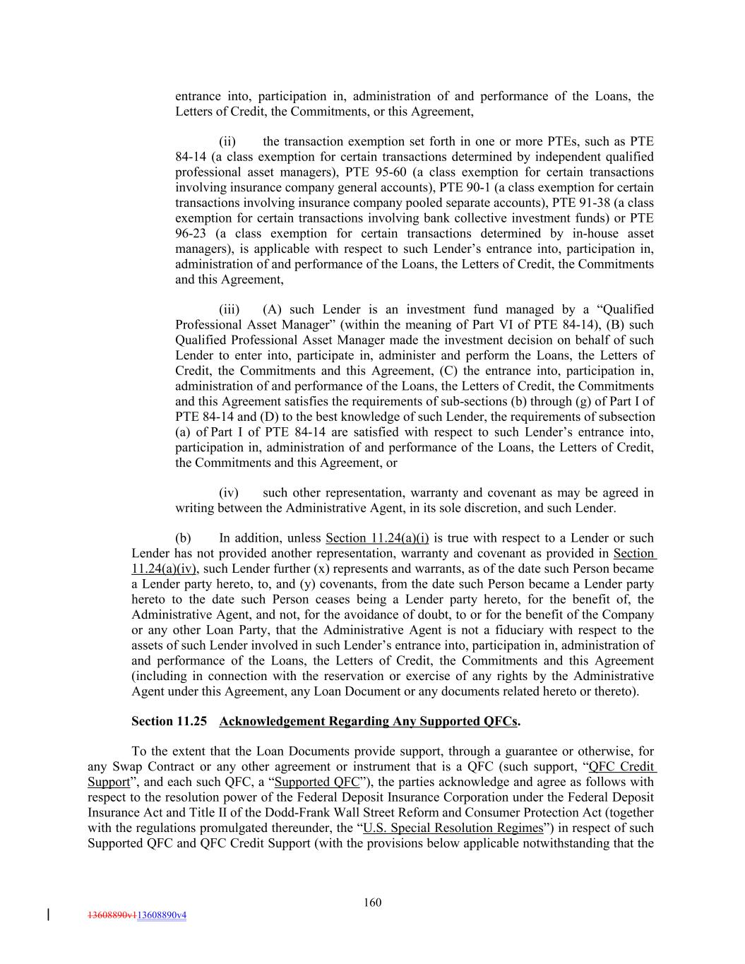 entrance into, participation in, administration of and performance of the Loans, the Letters of Credit, the Commitments, or this Agreement, (ii) the transaction exemption set forth in one or more PTEs, such as PTE 84-14 (a class exemption for certain transactions determined by independent qualified professional asset managers), PTE 95-60 (a class exemption for certain transactions involving insurance company general accounts), PTE 90-1 (a class exemption for certain transactions involving insurance company pooled separate accounts), PTE 91-38 (a class exemption for certain transactions involving bank collective investment funds) or PTE 96-23 (a class exemption for certain transactions determined by in-house asset managers), is applicable with respect to such Lender’s entrance into, participation in, administration of and performance of the Loans, the Letters of Credit, the Commitments and this Agreement, (iii) (A) such Lender is an investment fund managed by a “Qualified Professional Asset Manager” (within the meaning of Part VI of PTE 84-14), (B) such Qualified Professional Asset Manager made the investment decision on behalf of such Lender to enter into, participate in, administer and perform the Loans, the Letters of Credit, the Commitments and this Agreement, (C) the entrance into, participation in, administration of and performance of the Loans, the Letters of Credit, the Commitments and this Agreement satisfies the requirements of sub-sections (b) through (g) of Part I of PTE 84-14 and (D) to the best knowledge of such Lender, the requirements of subsection (a) of Part I of PTE 84-14 are satisfied with respect to such Lender’s entrance into, participation in, administration of and performance of the Loans, the Letters of Credit, the Commitments and this Agreement, or (iv) such other representation, warranty and covenant as may be agreed in writing between the Administrative Agent, in its sole discretion, and such Lender. (b) In addition, unless Section 11.24(a)(i) is true with respect to a Lender or such Lender has not provided another representation, warranty and covenant as provided in Section 11.24(a)(iv), such Lender further (x) represents and warrants, as of the date such Person became a Lender party hereto, to, and (y) covenants, from the date such Person became a Lender party hereto to the date such Person ceases being a Lender party hereto, for the benefit of, the Administrative Agent, and not, for the avoidance of doubt, to or for the benefit of the Company or any other Loan Party, that the Administrative Agent is not a fiduciary with respect to the assets of such Lender involved in such Lender’s entrance into, participation in, administration of and performance of the Loans, the Letters of Credit, the Commitments and this Agreement (including in connection with the reservation or exercise of any rights by the Administrative Agent under this Agreement, any Loan Document or any documents related hereto or thereto). Section 11.25 Acknowledgement Regarding Any Supported QFCs. To the extent that the Loan Documents provide support, through a guarantee or otherwise, for any Swap Contract or any other agreement or instrument that is a QFC (such support, “QFC Credit Support”, and each such QFC, a “Supported QFC”), the parties acknowledge and agree as follows with respect to the resolution power of the Federal Deposit Insurance Corporation under the Federal Deposit Insurance Act and Title II of the Dodd-Frank Wall Street Reform and Consumer Protection Act (together with the regulations promulgated thereunder, the “U.S. Special Resolution Regimes”) in respect of such Supported QFC and QFC Credit Support (with the provisions below applicable notwithstanding that the 160 13608890v113608890v4