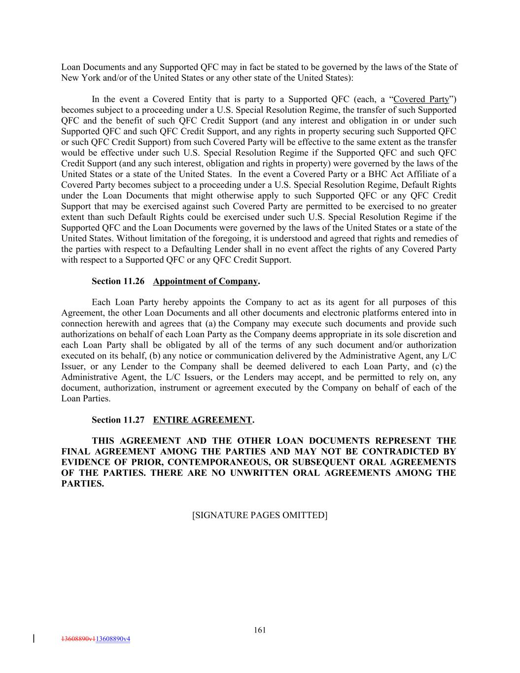 Loan Documents and any Supported QFC may in fact be stated to be governed by the laws of the State of New York and/or of the United States or any other state of the United States): In the event a Covered Entity that is party to a Supported QFC (each, a “Covered Party”) becomes subject to a proceeding under a U.S. Special Resolution Regime, the transfer of such Supported QFC and the benefit of such QFC Credit Support (and any interest and obligation in or under such Supported QFC and such QFC Credit Support, and any rights in property securing such Supported QFC or such QFC Credit Support) from such Covered Party will be effective to the same extent as the transfer would be effective under such U.S. Special Resolution Regime if the Supported QFC and such QFC Credit Support (and any such interest, obligation and rights in property) were governed by the laws of the United States or a state of the United States. In the event a Covered Party or a BHC Act Affiliate of a Covered Party becomes subject to a proceeding under a U.S. Special Resolution Regime, Default Rights under the Loan Documents that might otherwise apply to such Supported QFC or any QFC Credit Support that may be exercised against such Covered Party are permitted to be exercised to no greater extent than such Default Rights could be exercised under such U.S. Special Resolution Regime if the Supported QFC and the Loan Documents were governed by the laws of the United States or a state of the United States. Without limitation of the foregoing, it is understood and agreed that rights and remedies of the parties with respect to a Defaulting Lender shall in no event affect the rights of any Covered Party with respect to a Supported QFC or any QFC Credit Support. Section 11.26 Appointment of Company. Each Loan Party hereby appoints the Company to act as its agent for all purposes of this Agreement, the other Loan Documents and all other documents and electronic platforms entered into in connection herewith and agrees that (a) the Company may execute such documents and provide such authorizations on behalf of each Loan Party as the Company deems appropriate in its sole discretion and each Loan Party shall be obligated by all of the terms of any such document and/or authorization executed on its behalf, (b) any notice or communication delivered by the Administrative Agent, any L/C Issuer, or any Lender to the Company shall be deemed delivered to each Loan Party, and (c) the Administrative Agent, the L/C Issuers, or the Lenders may accept, and be permitted to rely on, any document, authorization, instrument or agreement executed by the Company on behalf of each of the Loan Parties. Section 11.27 ENTIRE AGREEMENT. THIS AGREEMENT AND THE OTHER LOAN DOCUMENTS REPRESENT THE FINAL AGREEMENT AMONG THE PARTIES AND MAY NOT BE CONTRADICTED BY EVIDENCE OF PRIOR, CONTEMPORANEOUS, OR SUBSEQUENT ORAL AGREEMENTS OF THE PARTIES. THERE ARE NO UNWRITTEN ORAL AGREEMENTS AMONG THE PARTIES. [SIGNATURE PAGES OMITTED] 161 13608890v113608890v4